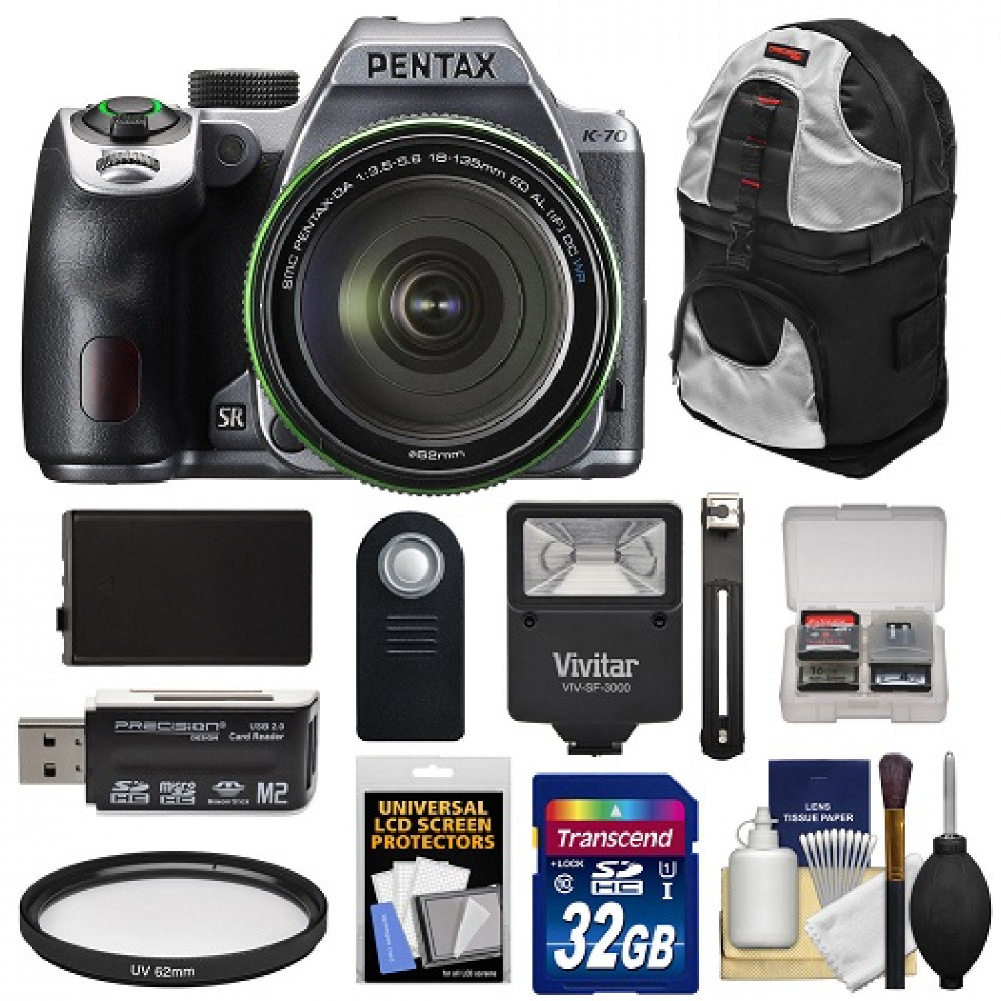 Camera Pentax K-70 DSLR com Lente 18-135mm e Kit de Acessorios (Prata)