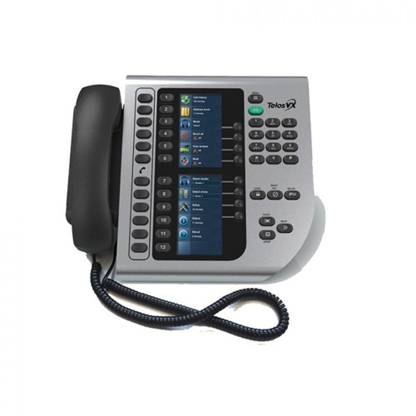 O telefone Telos VSet12 é lindamente projetado, com um display colorido LCD amigável que usa símbolos de status exclusivos para que os talentos saibam o que está acontecendo instantaneamente. O VSet12 pode lidar com até 12 linhas telefônicas, fornecendo informações detalhadas sobre o status da linha e do chamador em um piscar de olhos. O visor rico em informações mostra a identificação de chamadas de cada linha, juntamente com o tempo de chamada em espera ou em espera, e até mesmo os comentários do visualizador do aplicativo do software VX Producer.