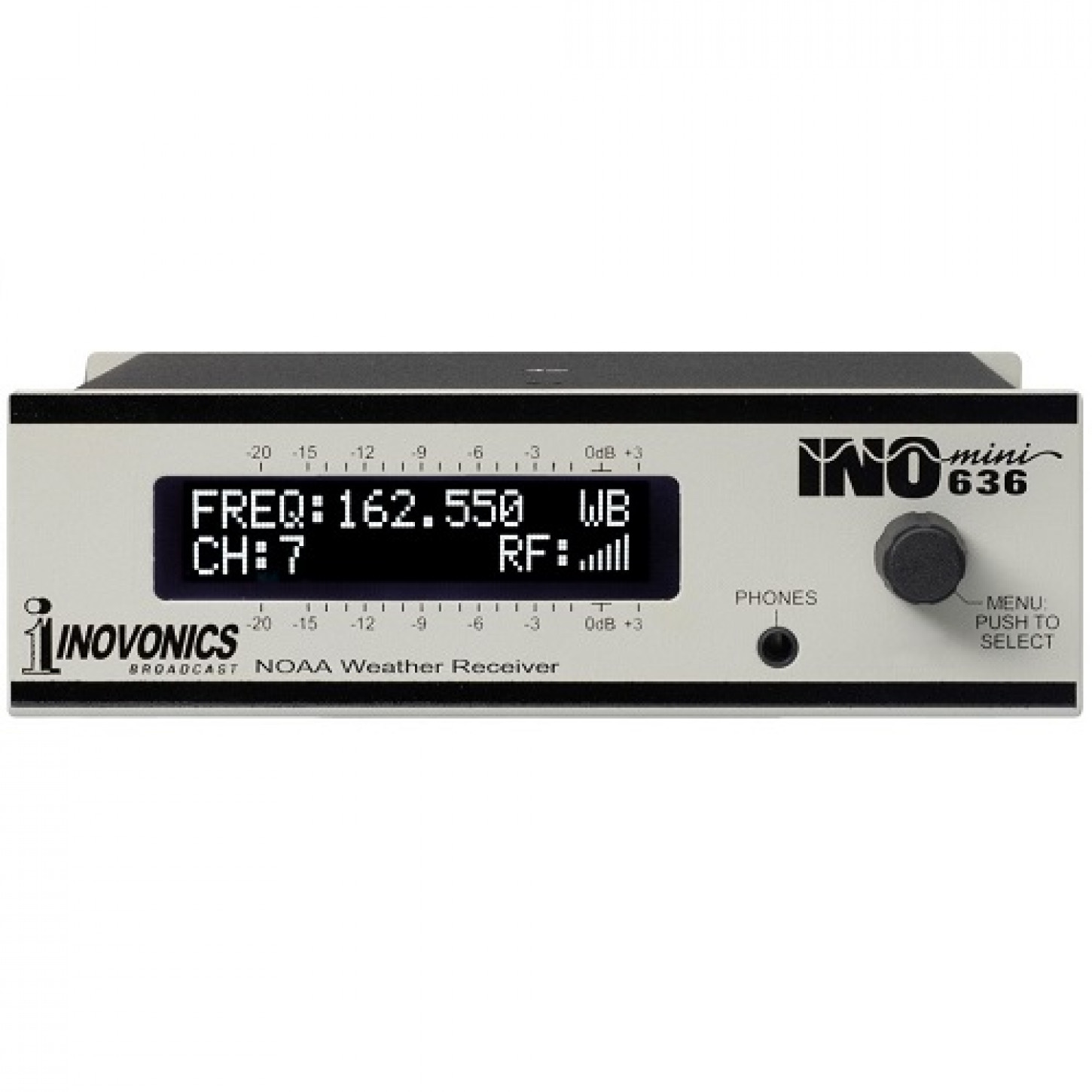 O INOmini 636 é um receptor definido por software com recursos de aprimoramento de voz digital para otimizar a articulação. Ele fornece saídas de linha balanceadas e digitais AES, além de alarmes para perda de portadora e de áudio, e para o tom de alerta NOAA de 1050Hz.