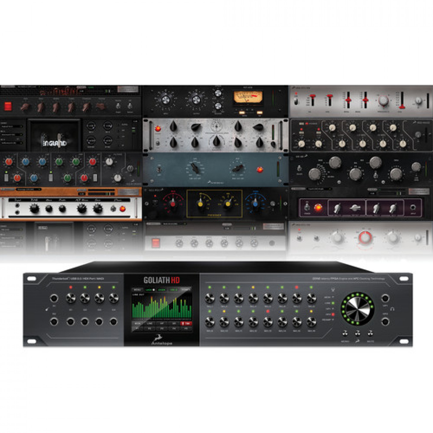 Com 16 pré-amplificadores de microfone Classe A, ampla conectividade digital e analógica e uma matriz de efeitos FPGA baseados em hardware integrados, o Goliath HD da Antelope é uma interface de áudio HDX, Thunderbolt, USB 3.0 e MADI projetada para funcionar como o centro de sua estúdio ou configuração de gravação ao vivo. A E / S oferece até 64 canais (32 entradas e saídas analógicas) de E / S, conversão AD / DA de 24 bits / 192 kHz, uma saída de monitor com grau de masterização com impressionante alcance dinâmico de 132 dB e conectividade adicional via conectores ADAT, S / PDIF, AES / EBU e DB25.