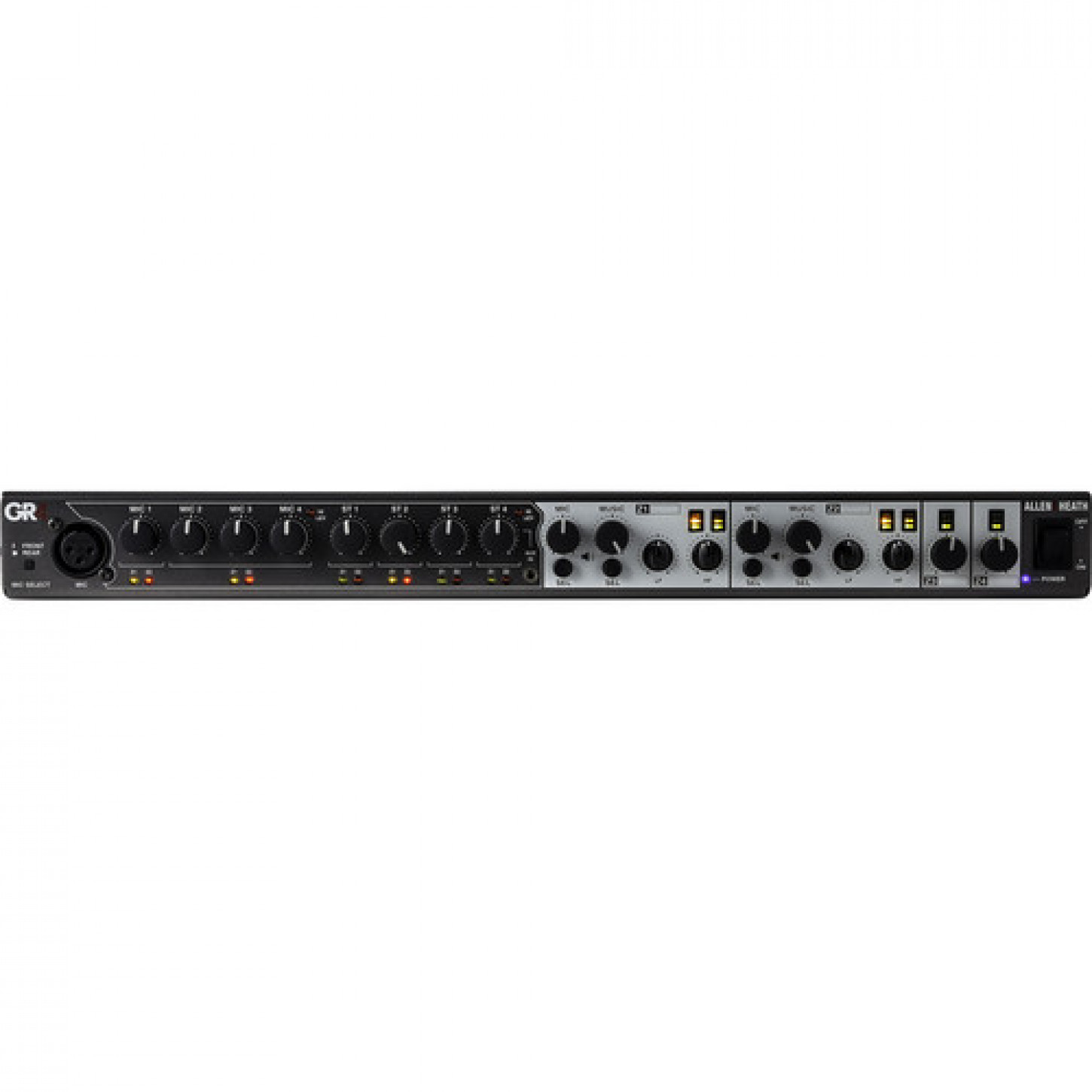 O GR4 da Allen & Heath é um mixer de áudio de mesa ou de rack único que fornece controle abrangente de paging e música de fundo em restaurantes, bares, lojas e outros ambientes de varejo / lazer. O mixer possui quatro entradas de mic no painel traseiro através de conectores Phoenix com uma opção para selecionar Mic 1 a partir de uma entrada XLR no painel frontal. Além disso, existem quatro pares de conectores RCA estéreo para dispositivos de reprodução de áudio. As duas saídas de zona são oferecidas em estéreo nos conectores Phoenix, mas podem ser alteradas para mono via jumpers internos. Duas saídas de zona mono adicionais (3 e 4) estão disponíveis com saída mix sendo selecionável de jumpers internos. O controle remoto PL-14 opcional fornece um controle de volume rotativo com quatro chaves de fonte selecionáveis e conecta-se através do cabeamento padrão Cat5e. O GR4 é fornecido com um cabo de alimentação, tampas de batoque em branco, um conjunto de orelhas de rack, quatro parafusos Pozi escareados e 14 conectores Phoenix.