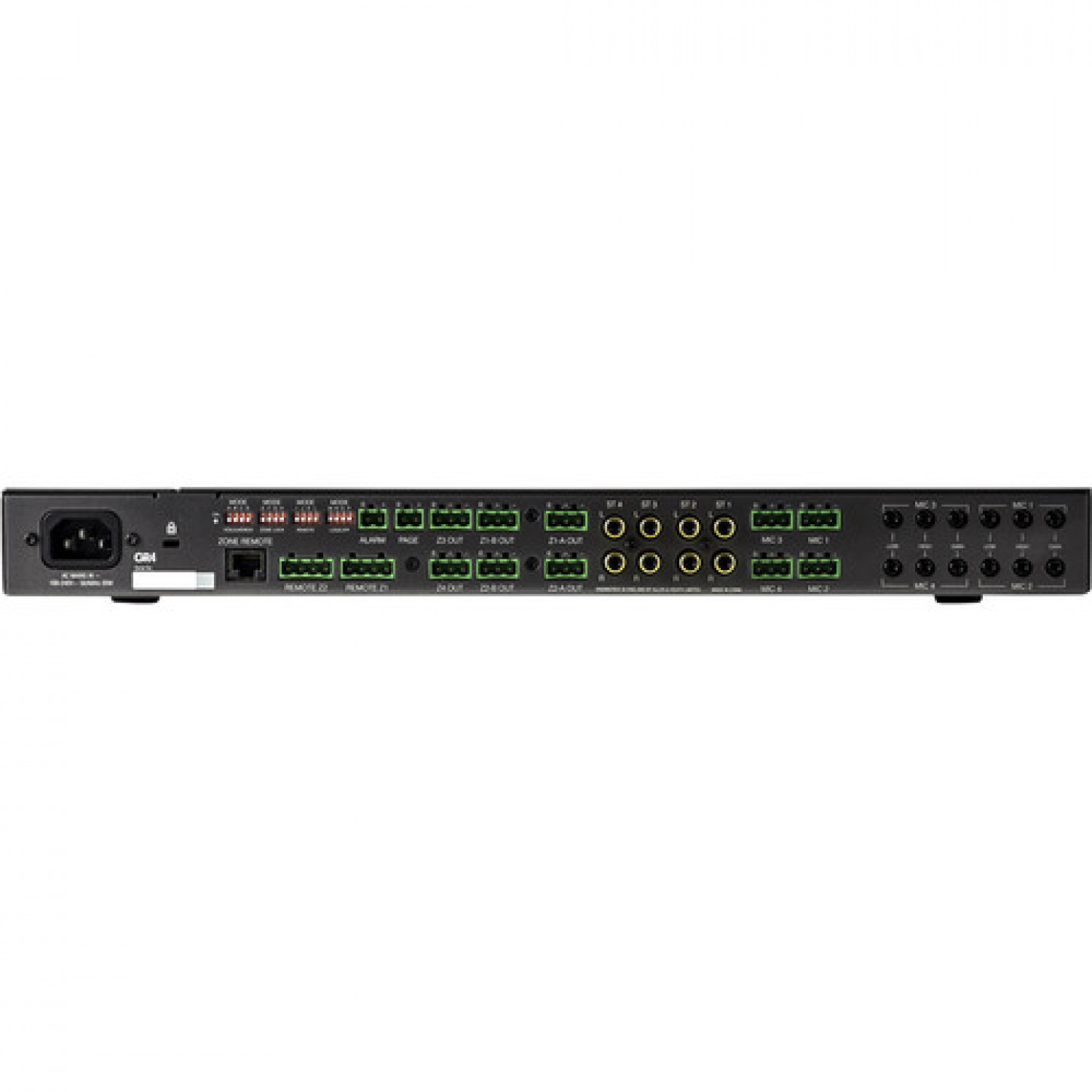 Saídas de zona: Duas zonas estéreo (mono selecionável via jumper interno) nos conectores Phoenix de montagem traseira. Duas saídas de zona mono adicionais estão disponíveis com saída mix sendo selecionável de jumpers internos.